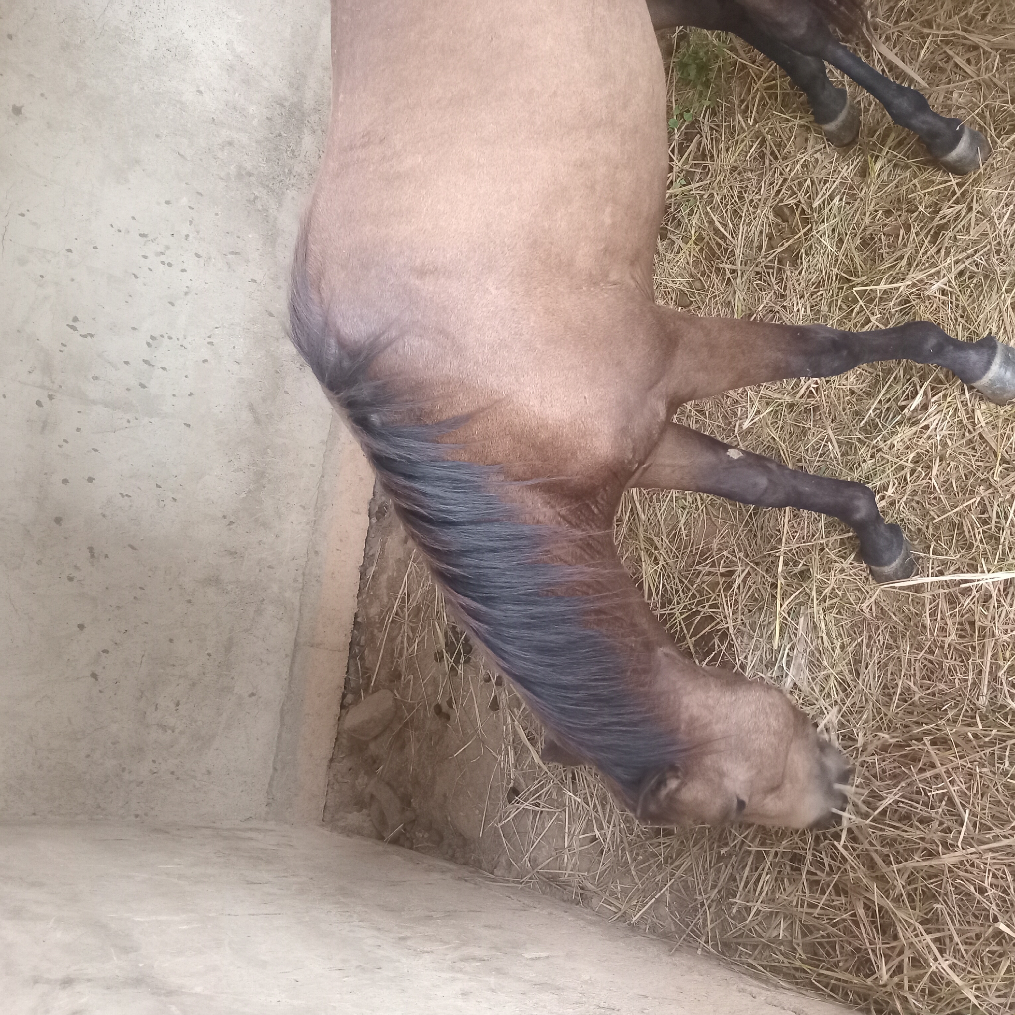 - "A horse lies on straw bedding within a partially enclosed space" by FM-WujkC2, licensed under CC BY 4.0