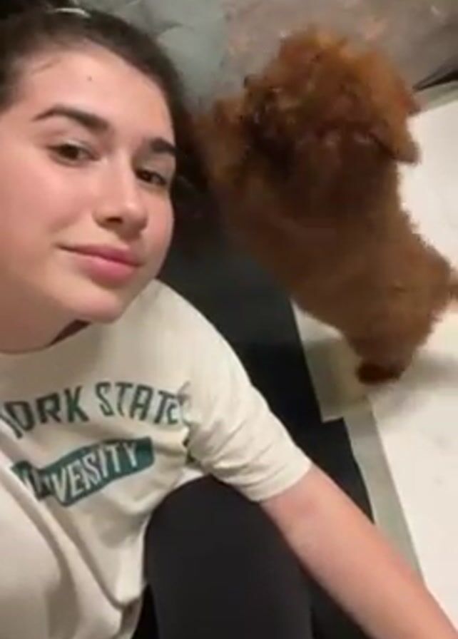 A person with long brown hair is wearing a white t-shirt with "York State University" printed on it and black leggings. The person is inside a black playpen for dogs. On the floor of the playpen is a white absorbent pad. A small, brown, fluffy dog runs around the playpen. The dog jumps on the person and licks her face.