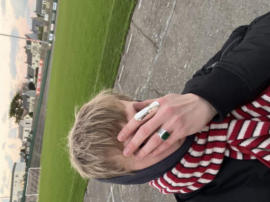 An individual is depicted from the chest up, their face largely obscured by their raised right hand. They have light-colored hair and wear a dark hooded garment, a red and white chevron-patterned knitted scarf, and a black bomber-style jacket. Their right hand features two rings: a prominent, elongated, polished silver-toned ring on the middle finger and a square-faced green stone ring with intricate silver detailing on the ring finger. The immediate foreground consists of a grey concrete surface with faded white lines. In the midground, a vibrant green grass sports field, identified as a football pitch, extends. A white goalpost frame is visible on the left side of the field. Beyond the field, a sloped bank hosts a partially visible red banner displaying white text, which reads "ALLEZ LES ROUGES." This banner, coupled with the stadium setting, identifies the location as the Stade Maurice Postaire in Cherbourg-en-Cotentin, France, home to the AS Cherbourg football club. The background reveals residential houses with light-colored facades and dark roofs, nestled against a sky exhibiting soft pastel hues of blue, pink, and orange, indicative of late afternoon or early evening.