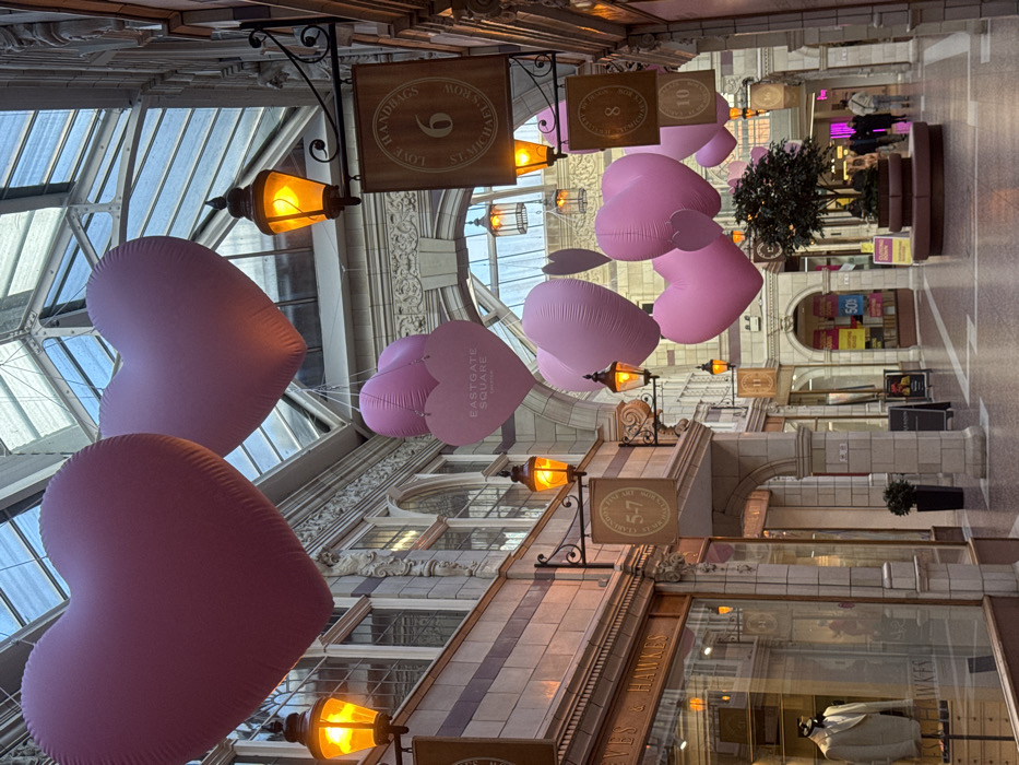 This image depicts a covered Victorian-era shopping arcade identified as Eastgate Square in Chester, United Kingdom. The arcade features a glass-paneled roof supported by an iron framework, allowing natural light to enter. The walls of the arcade are constructed from stone blocks, with architectural details including arched shopfronts, decorative pillars, and ornate friezes. Numerous traditional wall-mounted lanterns, emitting a warm yellow light, illuminate the passageway. The primary decorative element consists of multiple large and small inflatable heart-shaped balloons, primarily in shades of pink, suspended at varying heights from the ceiling structure. One larger pink heart balloon in the foreground bears the text "EASTGATE SQUARE CHESTER". On the left side of the arcade, shopfronts are visible, including "REEVES & HAWKES" at numbers 5-7 Eastgate Row, displaying a light-colored suit on a mannequin. On the right, a wooden sign for "LOVE HANDBAGS 6 ST MICHAEL'S ROW" is prominent, along with other signs indicating shop numbers such as 8, 10, 11, and 16. Further down the arcade, another shop displays a "50% OFF" promotion. In the mid-ground, a circular planter with integrated seating surrounds a small, leafy tree. The tiled floor of the arcade extends into the background. A few indistinct figures can be observed walking in the distance, indicating typical pedestrian activity within a shopping environment. No specific interactions or actions are clearly discernible among these distant individuals.