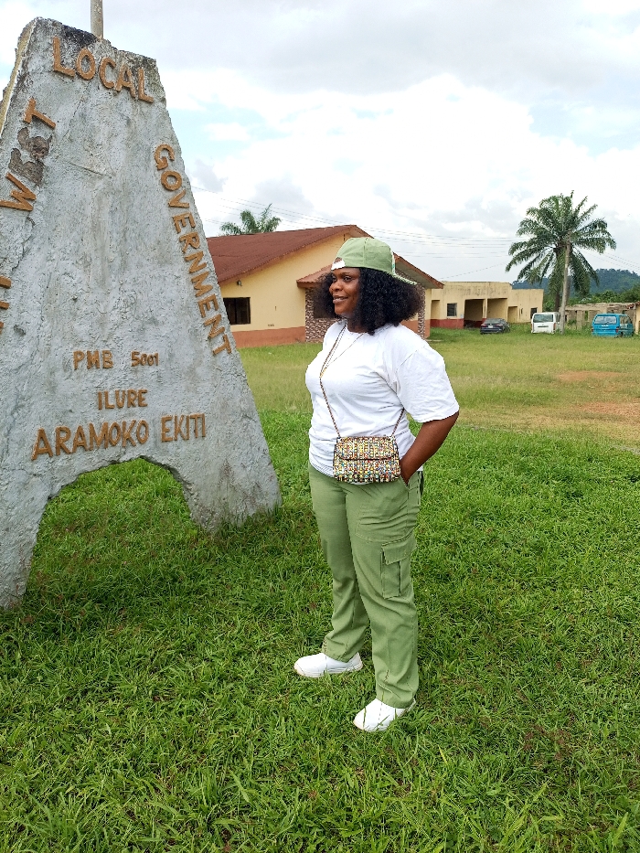 A female subject stands in a grassy area in Aramoko-Ekiti, Nigeria, positioned in front of a large, grey, triangular concrete signpost