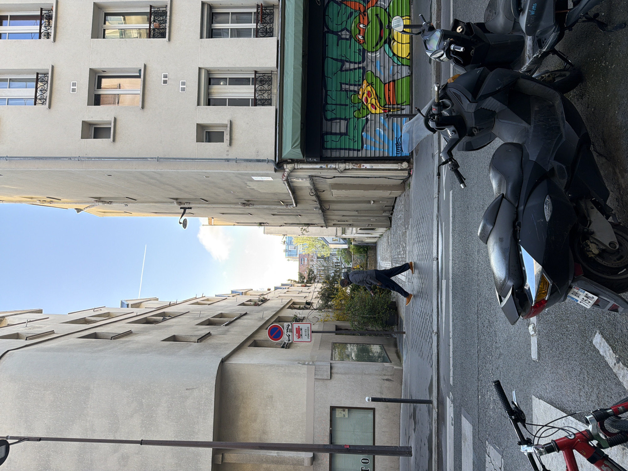narrow street in Paris, France. Tall buildings line both sides of the street, with a view down the street towards the horizon. On the right side of the street, parked scooters and a bicycle are visible. One man is walking down the street. Graffiti adorns a closed shutter on the right side of the street. Street signs are visible on the left side of the street. The sky is visible between the buildings, with a faint jet stream visible.