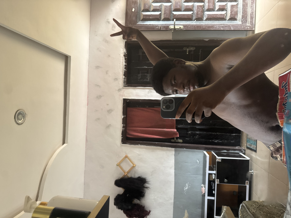 An image captured via a mirror selfie depicts a young adult male in an indoor setting in Gbongan, Nigeria