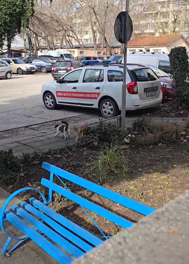 The scene captures a section of a city street adjacent to a parking area on what appears to be a sunny day. The foreground features a bright blue wooden bench positioned near a low concrete structure. Beyond the bench, there's a small patch of dirt and low-lying vegetation, where a group of four cats is observed. An orange tabby cat is walking through the bushes, while another cat rolls on the sidewalk. A third and fourth cat are sitting or lying still among the greenery. To the left, a parking area contains numerous parked cars, including a white station wagon with red lettering, which reads "Районен център по трансфузионна хематология" (Regional Center for Transfusion Hematology). In the background, trees line the street, and multi-story buildings can be seen in the distance. The overall environment appears urban, with typical city features.