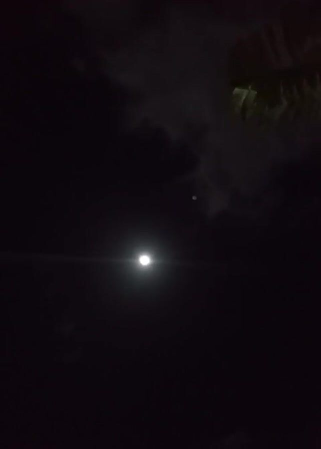 dark night sky with a bright, full moon shining. There are some clouds visible, partially obscuring the moon, and there are some leaves from a tree at the upper right corner of the frame. There is a lens flare to the side of the moon.