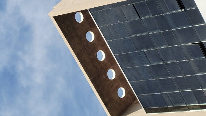 The image displays the upper exterior of the Latin American Art Museum of Buenos Aires (MALBA), located at Figueroa Alcorta 3415 in the Palermo neighborhood of Buenos Aires, Argentina. The prominent architectural feature is a horizontal, rough-textured concrete overhang positioned above a multi-story, dark, reflective glass facade. This overhang incorporates five uniformly spaced circular apertures, revealing a bright blue sky with scattered white cirrus clouds. The structural walls of the building are a light, smooth concrete. The glass facade below consists of numerous rectangular panels arranged in a grid, with several lower panels appearing slightly angled outwards, indicative of an operable louvre or window system. No individuals, objects, or actions beyond the static architecture and sky are present. The scene is illuminated by natural daylight.