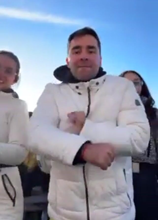 group of four people dancing on a sunny day. The man in the center is wearing a white puffer jacket and leads the dance, making hand gestures. To his left is a woman in a white ski suit, and to his right is a woman in a grey jacket with a fur collar. Behind them is a person wearing a ski helmet and goggles. The background is a bright blue sky, and the sun is shining directly into the camera. The group appears to be enjoying themselves and having fun.