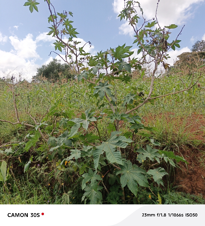 A vibrant, medium-shot captures a castor bean plant with large, palmate leaves, thriving in a grassy, overgrown field. Several spiky seed pods hang from the branches. In the background, tall grasses and maize stalks blend, creating a dense backdrop. A few trees are visible in the distance against a partly cloudy, blue sky. The camera settings "CAMON 30S", "23mm f/1.8 1/1066s ISO50" are printed at the bottom of the image.