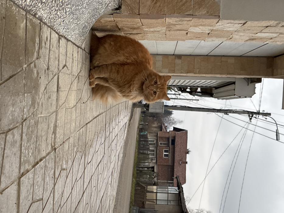 - "A fluffy, long-haired orange cat, wearing a red collar, sits upright on a light-grey, patterned concrete paver sidewalk in the city of Berkovitsa, Bulgaria" by FM-l7fR82, licensed under CC BY 4.0