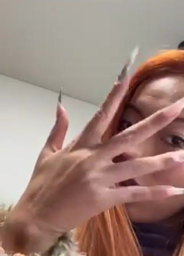 woman with long orange hair, wearing a fur jacket and a purple turtleneck shirt. She is holding up her right hand, showing off her extra-long fingernails. The nails are clear with silver and gray accents, and some have rhinestone decorations. She flexes her hand into a claw shape. The background is a plain white wall. There is faint chatter in the background.