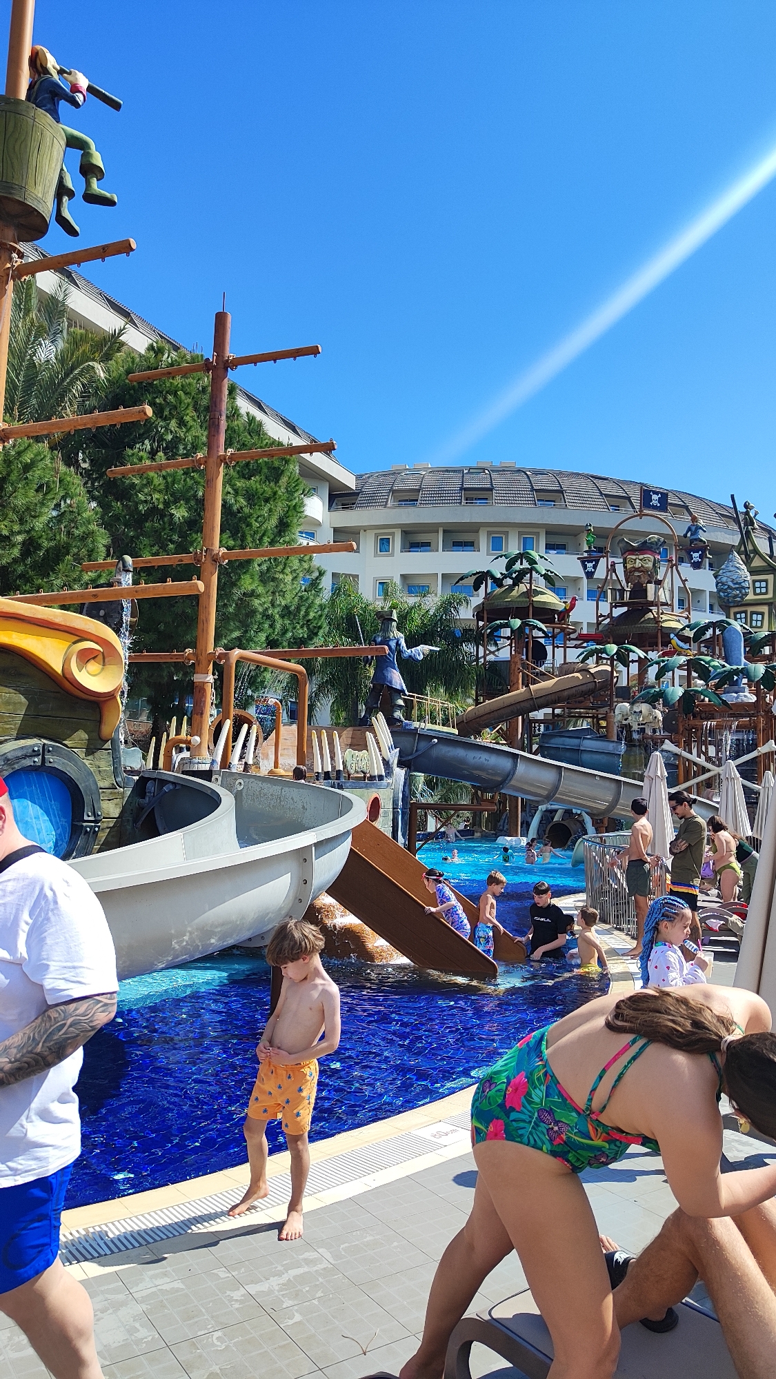 The image depicts a vibrant water park scene, likely within a resort, in Alanya, Turkey. The park is themed around pirates, featuring a large pirate ship structure with slides leading into a pool with dark blue, star-patterned tiling. Several people, mostly children and adults, are in or around the pool, including some waiting to go down the slides. In the foreground, a young boy with light brown hair stands at the edge of the pool, wearing orange swimming trunks. Other figures include an adult wearing a floral swimsuit, bending over someone seated on a lounge chair, and another adult in a white t-shirt and blue shorts partially visible on the left. Behind the pirate ship, additional water park structures are visible, including more slides and pirate-themed decorations. A large building with a domed roof stands in the background, potentially a part of the resort. The sky is clear and blue, with a bright light glare in the upper right corner.