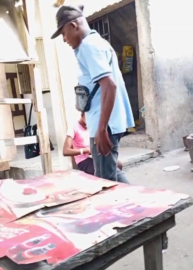 man in a light blue shirt and dark cap walking around a table covered with metal signs. A woman is sitting and eating at the table. Further behind the table, another woman is sitting and chopping food in a mortar and pestle. The setting appears to be an outdoor space with simple buildings and fencing in the background.