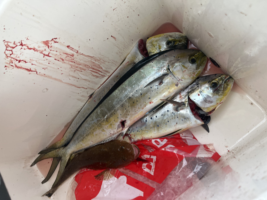 Three freshly caught mahi-mahi fish lie in a white bucket. The fish are silver with yellow heads and black stripes, and some have visible wounds. Blood splatters against the bucket's interior, and a small brown fish rests near the mahi-mahi tails on a red and white plastic bag, likely filled with ice. The scene suggests a successful fishing trip.