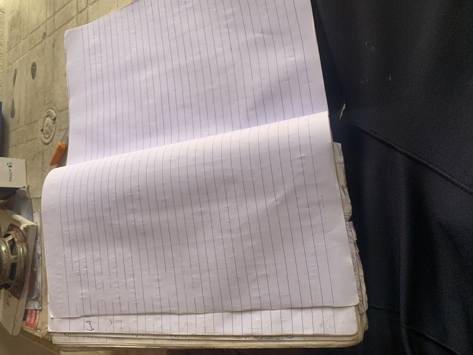 n open notebook lying flat on a black surface. The notebook is open to a fresh, blank page with lines running horizontally across the page. The notebook has a worn, white cover with some writing on the left side of the cover. An orange pen is lying on a table in the background. The table is covered with a white surface and has an unclear object on the right side of the frame. The location is in Umuola, Nigeria, which is in the south of the country near the Niger River and the Atlantic Ocean. The coordinates provided (latitude: 4.887, longitude: 7.031) correspond to a location within Umuola. The location is in the tropical rainforest region with a warm and humid climate. There are no people visible in the image.
