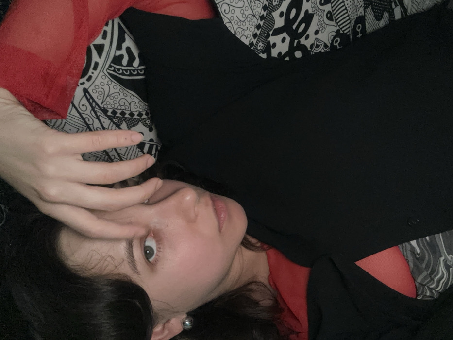 A woman with dark hair and light eyes gazes into the camera, her hand partially obscuring her forehead. She's lying on a patterned surface, possibly a bed or floor. She is wearing a black top layered over a red shirt. A silver earring is visible on her left ear. The lighting is dim, casting soft shadows on her face. The background is a mix of black and white patterns.