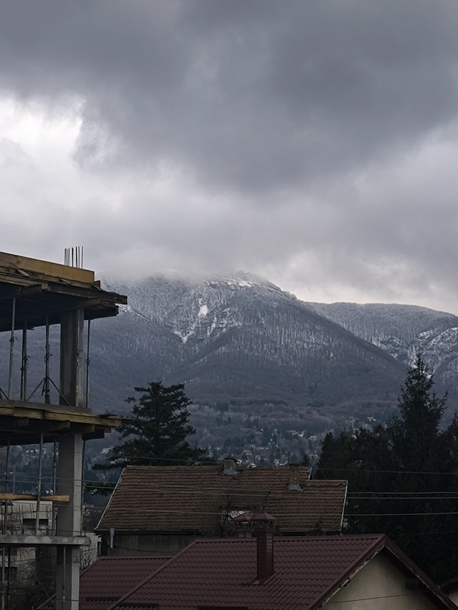 The image displays an outdoor scene in Sofia, Bulgaria, overlooking residential areas with Vitosha Mountain in the background under an overcast, grey sky