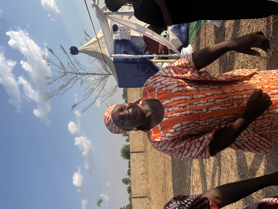The scene is set outdoors in Unknown, Nigeria, under a clear blue sky with scattered white cumulus clouds, indicating daytime. The primary subject is an adult female, likely of middle age, with a dark complexion, wearing an orange and white patterned headwrap and a matching loose-fitting, short-sleeved garment. She stands facing forward, looking slightly to her right, with a neutral expression. Her hands are positioned at her sides, slightly open. The left arm and torso of another individual in a patterned garment are partially visible in the bottom left. The right torso and arm of a third individual in a black garment are partially visible on the right. Behind the primary subject, a small, peaked event tent is visible. It is adorned with white fabric draping and blue floral decorations at its peak and along its side. A deciduous tree with bare branches stands behind the tent. The ground is dry, reddish-brown earth with sparse dry vegetation. A low, light-colored concrete block wall extends across the mid-background.