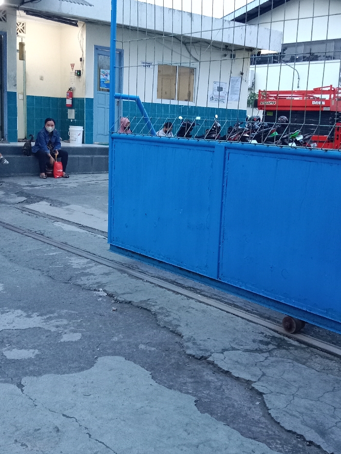 This image, set in Semarang, Indonesia, captures an outdoor scene at what appears to be an entrance or secure compound. The foreground shows cracked and worn concrete paving, containing two parallel metal tracks used by a large, weathered blue metal sliding gate, which is positioned partially open on the right, revealing a bottom roller wheel. A vertical blue metal post or pipe stands to the immediate left of the gate. On the left side of the frame, a person is seated on a raised concrete platform. This individual wears a face mask, a blue denim jacket, dark trousers, and sandals, holding a red shopping bag and a small dark object. A dark backpack rests beside them on the platform. The foot of another person is partially visible next to the seated individual. Behind them is a building facade, characterized by a lower section of teal-blue tiles and an upper section of light-colored paint. A light blue door is visible, along with a wall-mounted red fire extinguisher and a white plastic bucket on the ground. Exposed electrical conduits and a light fixture are visible under an overhang. Behind the blue gate and above it, a galvanized wire mesh fence is visible. Beyond this barrier, a parking area contains multiple parked motorcycles. Two individuals are partially visible among the motorcycles: one wearing a pink head covering and another in a light-colored shirt. Further in the background, a red utility vehicle with an elevated cargo bed is partially discernible.