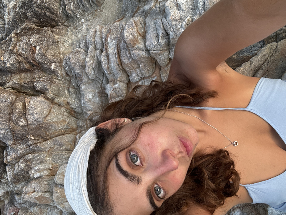 An upward-angled, close-up selfie-style image depicts a young adult female positioned against a textured rock formation, identified as being in Ban Ko Li Pe, Thailand