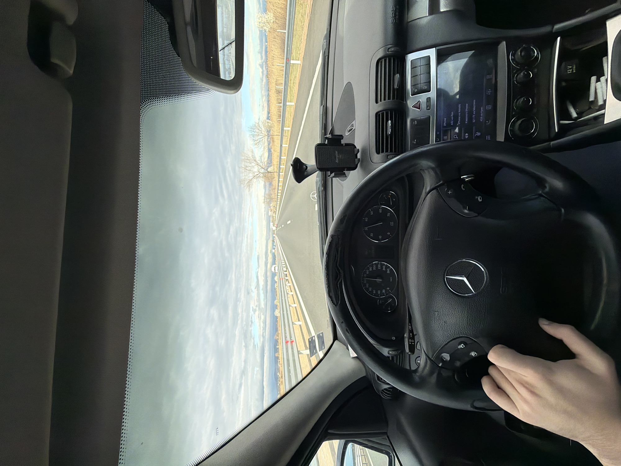The interior of a car is depicted from the driver's perspective, with a black steering wheel prominently featuring the Mercedes-Benz logo. The driver's hand is visible on the right side of the steering wheel. The dashboard includes a display screen and various controls. A smartphone holder is mounted on the dashboard. Outside the car, a highway stretches into the distance under a cloudy sky, flanked by fields. The location in Saraia, Bulgaria, is not discernible from the image.