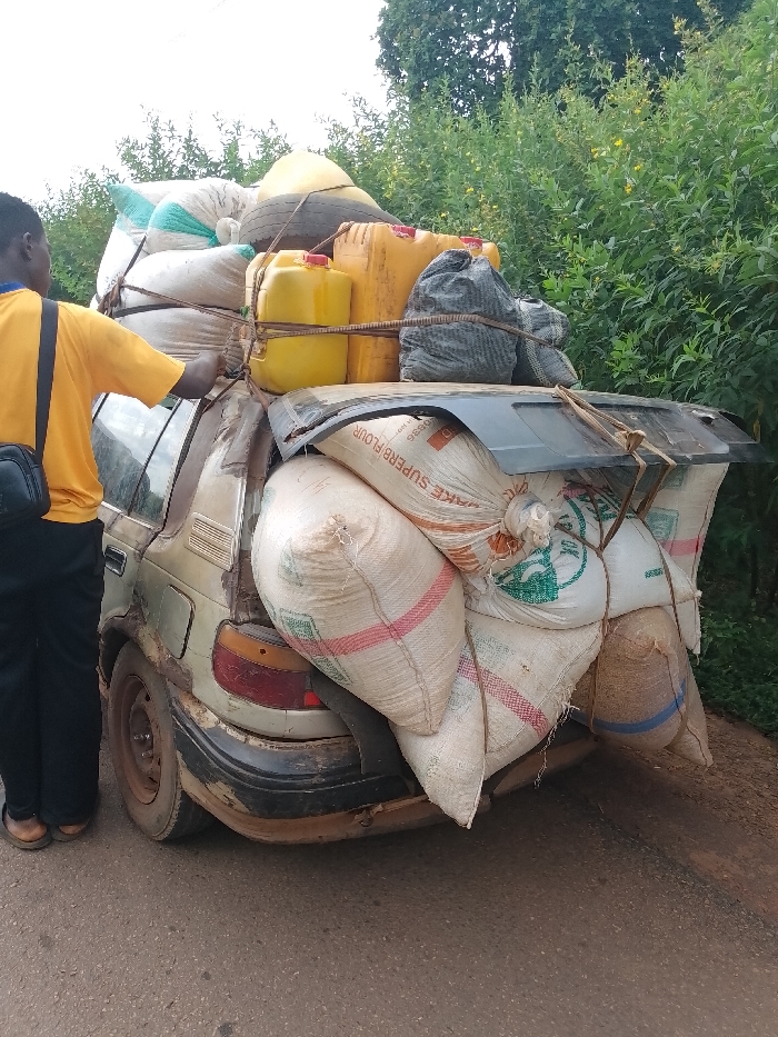 In Ugwolawo, Nigeria, a heavily overloaded, older model sedan, possibly silver or light-colored, is stationary on a paved road