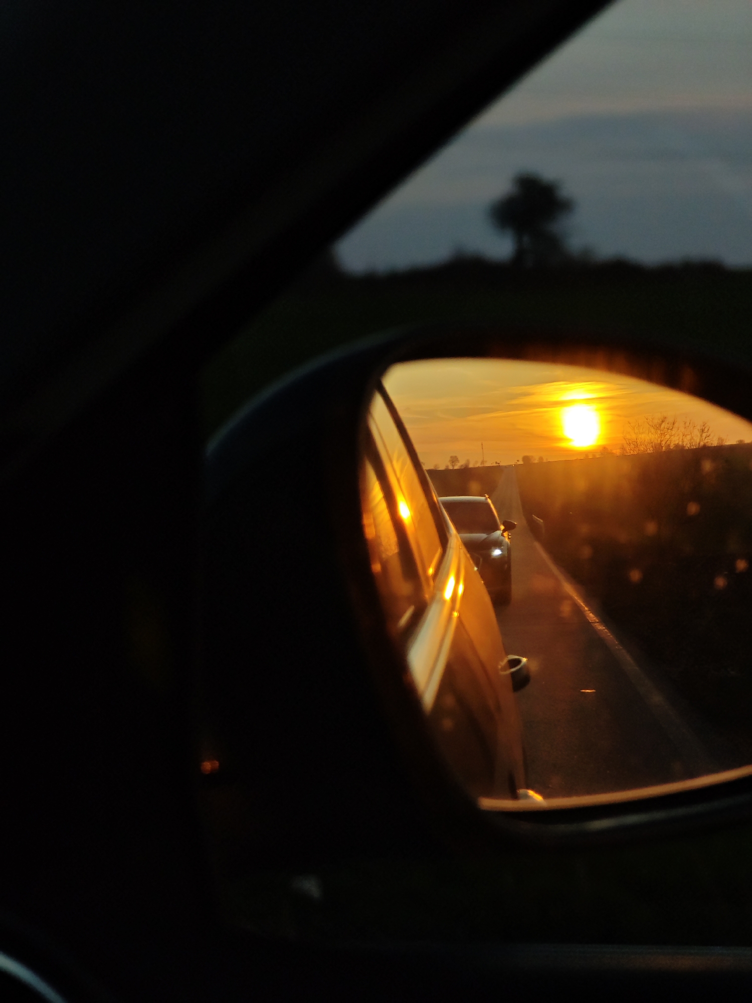 sunset scene reflected in a car's side mirror. In the mirror, a road stretches into the distance towards the setting sun. Another car is visible on the road behind the vehicle taking the photo. The surrounding landscape appears to be fields with some trees and vegetation. The location is unspecified, and there's no information given about Kamenar, Bulgaria.