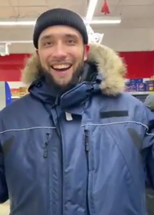 A man is standing in a grocery store, holding two boxes of the same product and smiling. He is wearing a dark blue winter coat with a fur-trimmed hood and a black beanie. The store has fluorescent lighting and shelves stocked with groceries. In the background, other shoppers can be seen. The man raises the boxes in the air and dances while still smiling. There is Christmas decor hanging from the ceiling. He is clearly happy with his purchase.