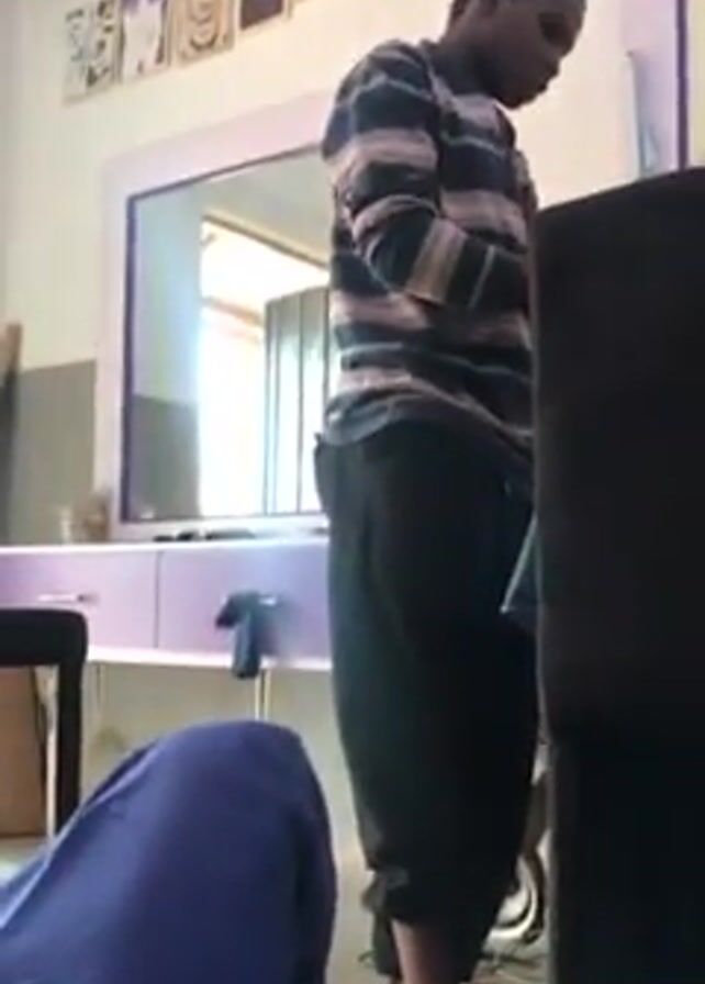 person in a striped shirt and black pants, wearing black sandals, standing in a room with a vanity. The vanity is painted a light purple color, with a mirror above it. There are pictures on the wall above the vanity, and a chair is visible in the foreground. The person appears to be looking down at something on the vanity. Another person is partially visible in the lower left corner, wearing blue clothing. The room seems to be a dressing or makeup area.