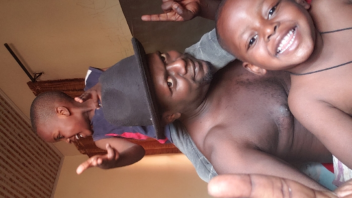 A man wearing a black hat smiles with two children. One child is next to the man, grinning broadly. The other child is on the opposite side, laughing and gesturing with their hands. The man appears shirtless. The background includes a wall, a headboard, and part of a window.