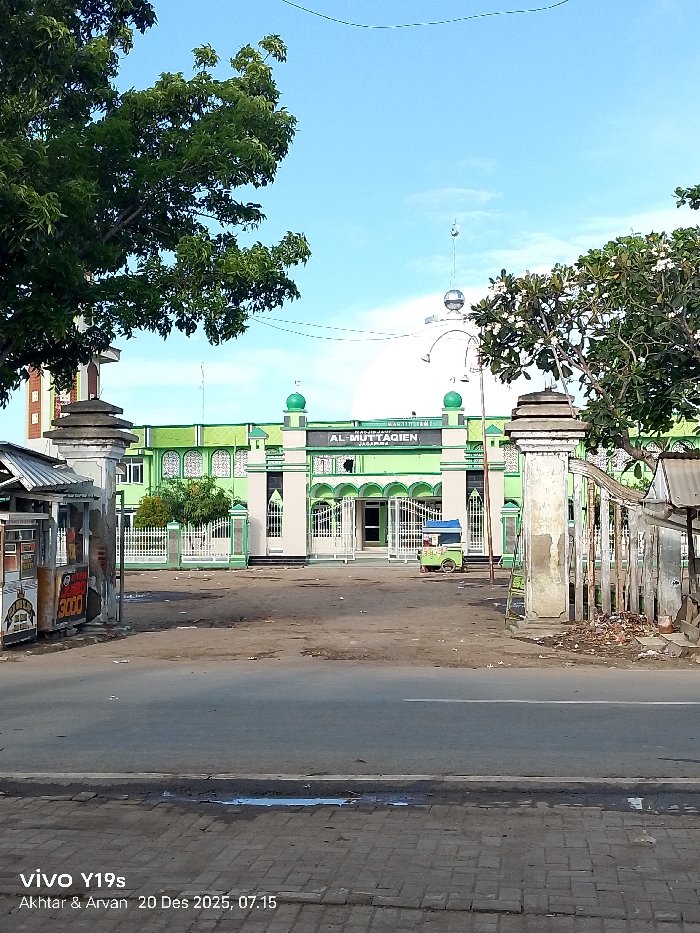 A daytime shot captures the Masjid Al-Muttaqien Jagamima, painted green and white. The mosque sits beyond a spacious courtyard, littered with debris, accessed through a gated entrance. The foreground shows a paved road, with structures on either side of the gateway partially obscured by trees and utility poles. A street vendor's cart is stationed in front of the mosque. The photo's lower left corner displays a vendor's stall and the text "vivo Y19s" with the names "Akhtar & Arvan" and date "20 Des 2025, 07.15".