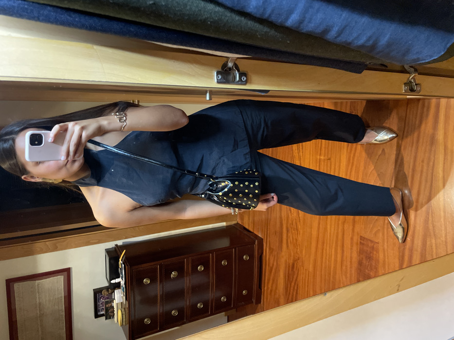 This image depicts a full-length mirror selfie of a female individual captured indoors, within the city of Aldoar, Foz do Douro e Nevogilde, Portugal. The subject is standing on a polished reddish-brown wooden floor, wearing a dark, possibly navy or black, halter-neck top paired with matching wide-leg trousers. Her face is largely obscured by a light pink smartphone, held in her right hand, which she is using to take the photograph. Accessories worn include gold-toned earrings (partially visible), a gold-colored snake-shaped bracelet on her right wrist, and a small black bucket-style handbag adorned with numerous gold studs, carried over her left shoulder via a thin strap. She is wearing gold-colored, pointed-toe flat shoes. The background, reflected in the mirror, shows an interior space. To the left of the subject, a dark reddish-brown wooden chest of drawers with five visible drawers and small, gold-toned circular pull handles is present. Various small items, including a brush set and a dark box, are arranged on top of the chest. Above the chest, a framed picture or artwork with a dark red frame is mounted on a light-colored wall. To the right of the subject, a light-colored wooden door frame or partition is visible, featuring a metallic door hinge. Adjacent to this frame, dark fabric, possibly clothing, hangs vertically.