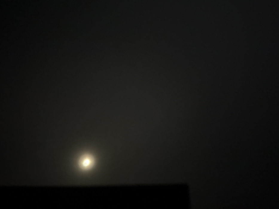 A dark, blurry image presents a low-positioned, luminous, circular object, possibly the moon