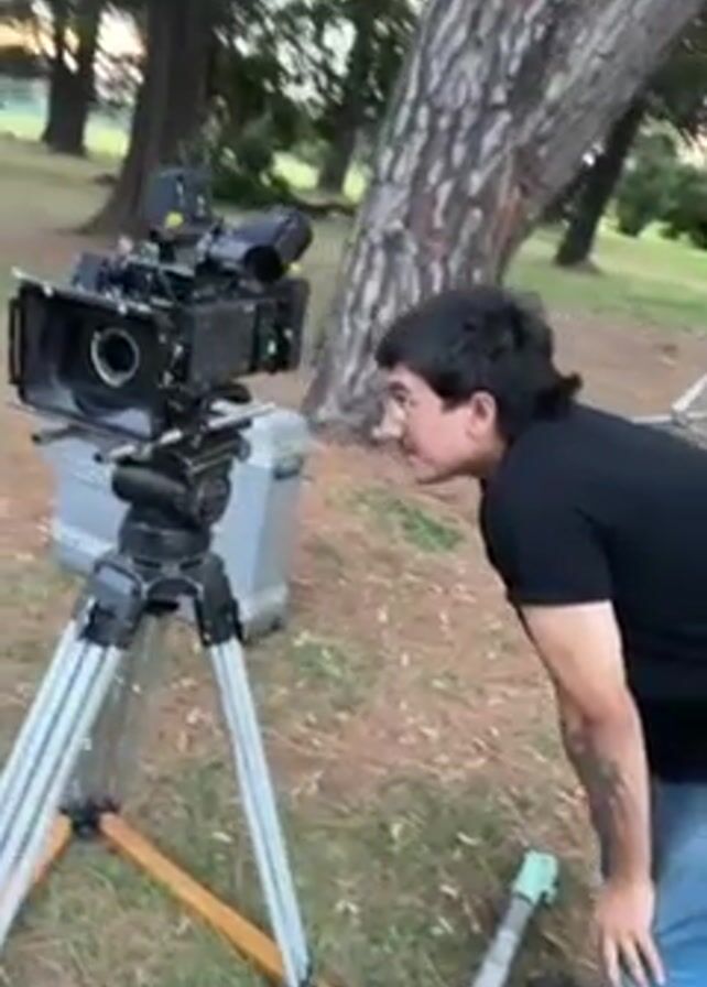 man in his 20s, wearing glasses and a black shirt with short denim shorts, standing next to a professional film camera mounted on a tripod in a grassy area, possibly a park. The camera is large and complex with various attachments and screens. The man appears to be inspecting or adjusting the camera. There's a large tree in the background and an equipment case nearby. The lighting suggests it might be late afternoon or early evening. The scene appears to be a film set or a location for professional video shooting.