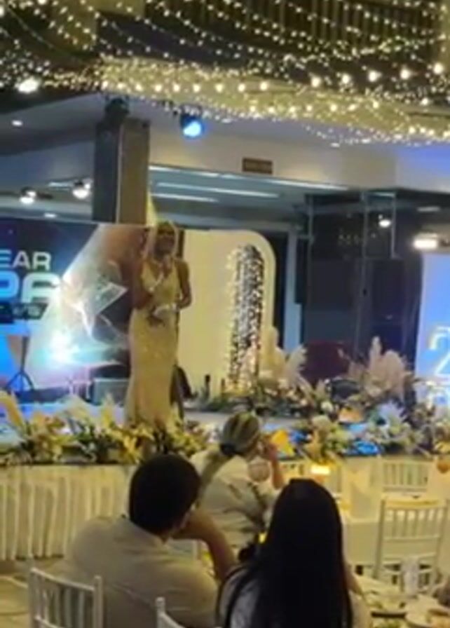 A person dressed in drag is singing on stage at what appears to be a New Year’s Eve party