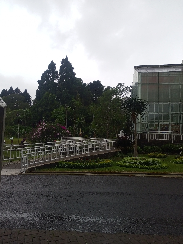 The image captures an outdoor scene in Beni, Nepal, under an overcast, grey sky. In the foreground, a dark asphalt road, visibly wet with rainwater, occupies the lower third of the frame, bordered by a dark reddish-brown brick pavement strip on the immediate left. Directly behind the road, a white accessibility ramp with horizontal railings ascends gently from left to right, transitioning into a multi-segment structure. Landscaped green areas with manicured hedges and flowering plants in shades of purple and pink are situated around the ramp and extend towards the right. To the right, a multi-story building with a modern glass and metal facade is prominent, featuring numerous rectangular window panes and a slightly reflective roof. A single palm-like tree with a thick, dark trunk stands in front of this building, surrounded by circular shrub beds. The background is dominated by dense, lush green foliage consisting of various tree species, including several tall, dark coniferous trees that pierce the skyline. A utility pole is visible amidst the trees on the left side. Two indistinct figures are discernible in the far left-midground: one person is holding an open, light-colored umbrella, while another individual and a white scooter are partially visible nearby. The overall environment suggests a well-maintained urban or semi-urban setting with a focus on greenery and accessibility.