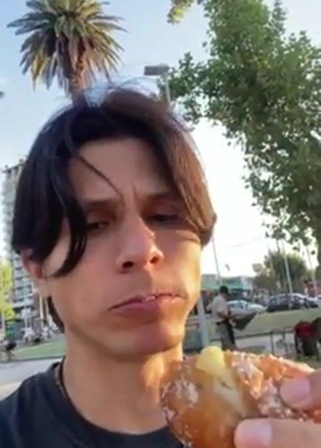 A young man stands outside and eats a cream-filled pastry covered with powdered sugar. The pastry is held in his right hand. He sticks his tongue out and chews contentedly. He wears a gray t-shirt and has dark hair with bangs. A palm tree and leafy tree are visible behind him, as well as a street with cars and buildings. The sky is clear and blue.