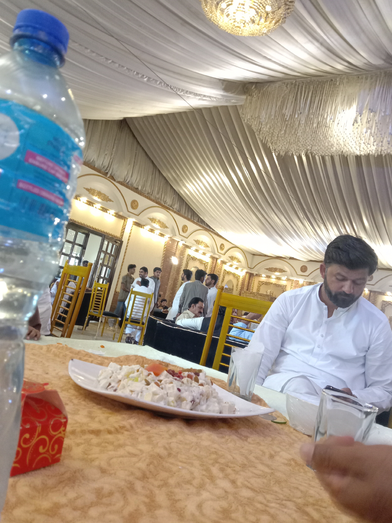 The image depicts an indoor social gathering within a decorated hall. The specific location within Kot Bhattian, Pakistan, is not discernible from the visual evidence. In the immediate foreground, a clear plastic water bottle with a blue cap is partially visible on the left. The table surface is covered with a textured gold-orange tablecloth. A white rectangular plate holds a creamy salad with visible fruit or vegetable pieces and nuts, topped with a red item. A small red gift box with gold patterns is to the left of the plate. On the right, a clear drinking glass is held by a person's hand, and another clear glass and a white bowl wrapped in plastic are visible on the table. In the midground, a man with a dark beard and hair, dressed in a white shalwar kameez, is seated at a table on the right, looking down at a mobile phone in his hands. Behind him, and extending into the background, are numerous other men, mostly wearing similar traditional attire. Some are seated at tables with yellow-framed chairs, while others are standing and conversing near ornate double doors with glass panes on the left side of the frame. The hall features a ceiling draped extensively with pleated white fabric. Multiple chandeliers, including a prominent gold-toned fixture, are suspended from the ceiling. The walls are light-colored, adorned with decorative gold trim and arched architectural details, and illuminated by warm lighting.