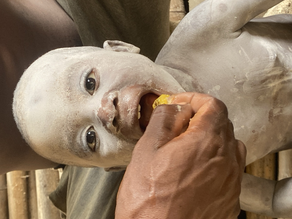 In Achara, Nigeria, a close-up image captures a baby with light-colored skin, fully coated in a fine, off-white powdery substance, from the head down to the exposed torso