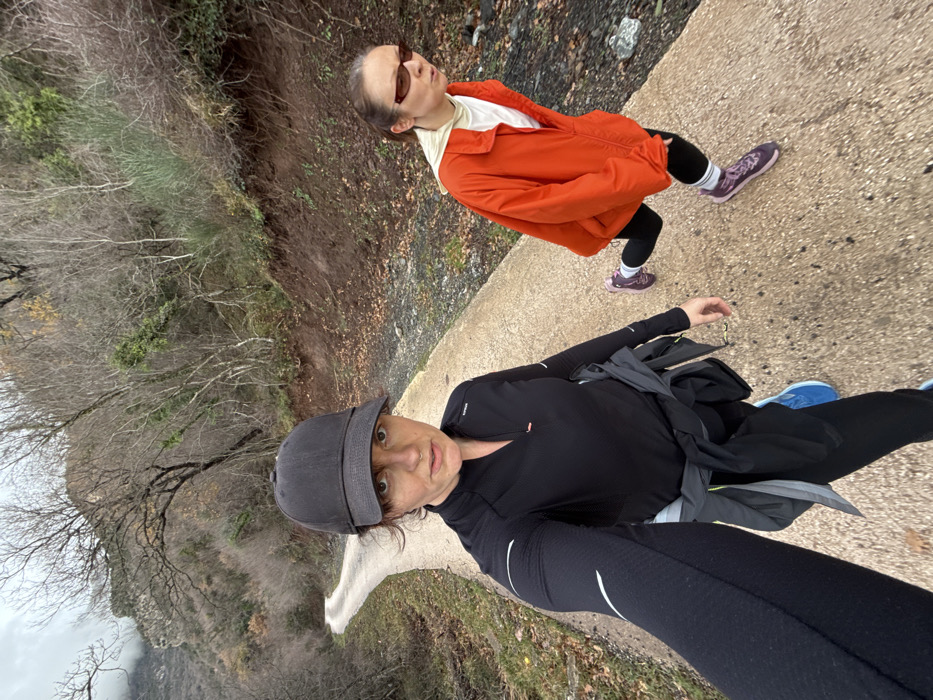 Two adult females are positioned on a winding, light-colored paved path in a mountainous, wooded environment in Čučuci, Montenegro, under an overcast sky. The female in the foreground, facing the camera, has dark hair partially covered by a dark gray baseball cap, a nose ring on her right nostril, and is wearing a black long-sleeved athletic top, black athletic pants, and partially visible blue athletic shoes. A dark gray jacket is tied around her waist. The second female, positioned further back and to the right, is shown in profile, looking towards her left with a slightly open mouth. She wears narrow, reddish-brown sunglasses, a bright orange oversized jacket over a light-colored hooded top, black athletic pants, and purple/maroon athletic shoes. The path ascends into the background, curving left, flanked by a steep reddish-brown dirt embankment with sparse vegetation on the right, and dense deciduous trees, mostly bare of leaves, on the left and in the background. Rocky mountains, partially obscured by cloud cover, are visible in the distance.