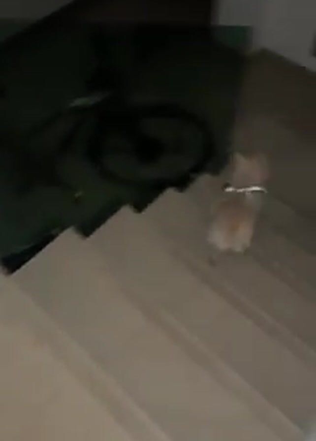 small, light brown dog walking down a set of tiled stairs in a house. The dog has a harness on. After reaching the bottom of the stairs, the dog pauses, and then walks away down a tiled hallway. The room is dark. A green glass table and a bicycle are visible in the room by the stairs.
