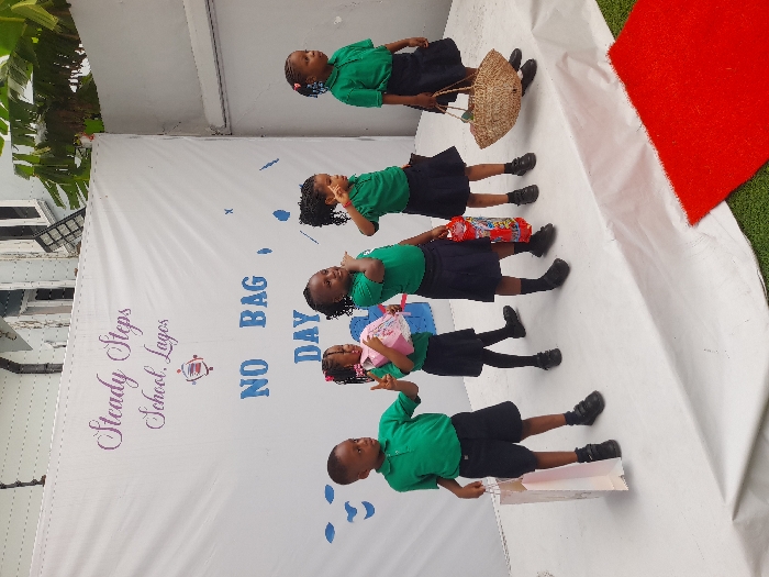 An outdoor scene at Steady Steps School in Ojomu, Lagos, Nigeria, depicts five young children standing on a white fabric-covered platform. The group comprises one boy on the far left and four girls. All children wear green polo shirts and dark bottoms; the boy wears shorts, and the girls wear skirts, all with dark shoes. From left to right, the children are holding a white paper bag, a pink rectangular container, a red cylindrical container; the fourth child holds no discernible item, and the fifth child holds a woven straw basket. Behind them, a white banner is displayed with "Steady Steps School. Lagos" in purple script and "NO BAG DAY" in blue block letters, augmented by small blue wave-like symbols. The foreground features green artificial turf with a red carpet section extending from the bottom right. A light-colored building with multiple windows and green tropical foliage are visible in the background.