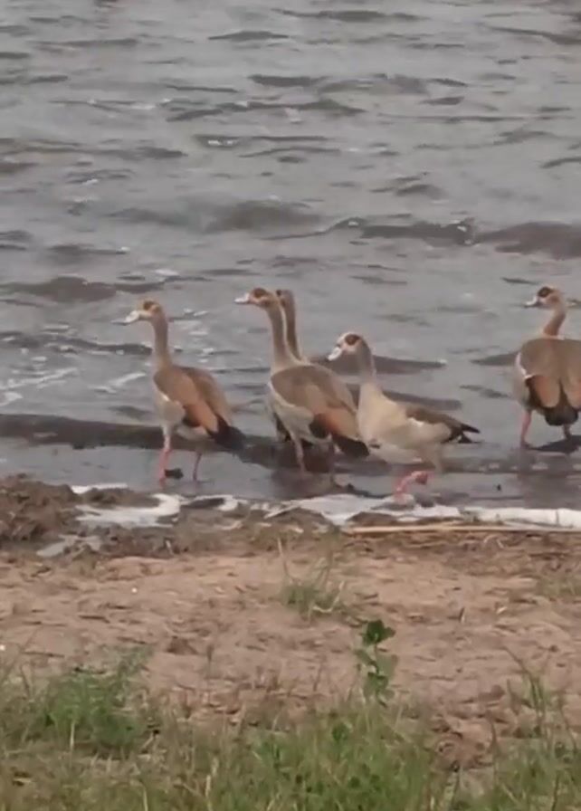 group of Egyptian geese standing at the edge of a body of water. There are five geese visible, and they are all facing to the left of the frame. The water appears somewhat choppy, with small waves lapping at the shore. The shoreline is sandy and muddy, with some green grass visible in the foreground. In the water, a few pieces of driftwood or other debris can be seen. The overall lighting suggests it's an overcast day. One goose in the foreground takes a step forward. A voice says "Yes."