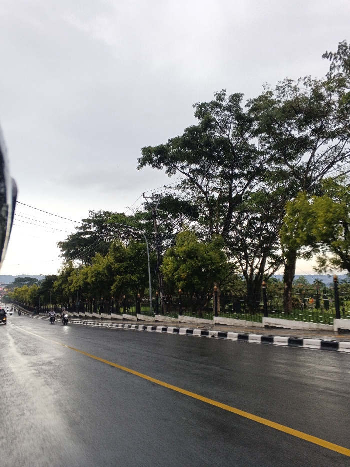 The image depicts an outdoor urban road scene in Sindangjaya, Indonesia, under an overcast sky with diffused natural light. The wet asphalt road, potentially a two-lane thoroughfare, curves gently to the left and is marked by a continuous yellow line. A curb with alternating black and white painted sections separates the road from a paved area or median strip. Along the right side of the road, a row of smaller, leafy green trees stands in front of a dark metal fence with decorative golden accents. Behind this, taller, mature trees with dense green canopies dominate the background, alongside a utility pole supporting multiple overhead power lines. In the distance, on the road, several motorcycles are visible, moving in the same direction as the observer. A dark, curved object, likely the edge of a helmet or vehicle frame, intrudes into the upper left quadrant of the frame, suggesting a point-of-view shot from a moving vehicle.