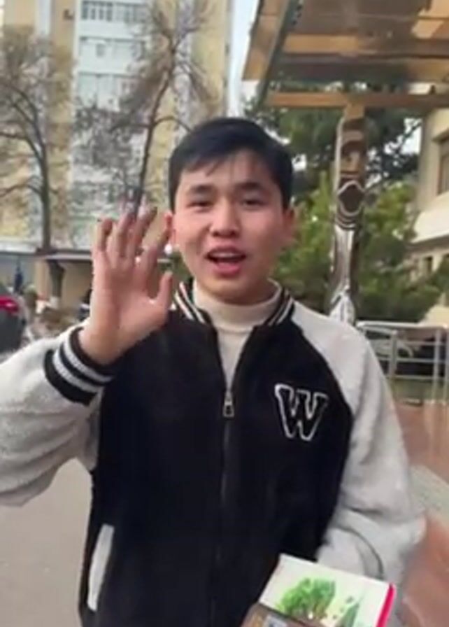 young man standing outdoors in front of a building. He is wearing a black and white jacket with a letter "W" on it, and a white turtleneck sweater. He is holding a notebook and a cell phone in his left hand. He waves his right hand towards the camera. The background includes a multi-story building, trees, and a silver-colored architectural structure. The weather appears to be overcast.