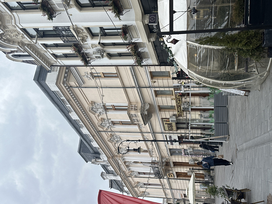 The image displays a pedestrian street scene in Craiova, Romania, specifically on Strada Lipscani, under an overcast sky. The left side of the street is lined by a multi-story, cream-colored building featuring classical ornate architectural details, including decorative window frames, cornices, balustrades, and a dark mansard roof with dormer windows. Ground-level storefronts include "GSM" and "Belle Optique." Adjacent to it on the right, a multi-story white building, also exhibiting classical ornamentation, features black wrought-iron balconies with planter boxes containing greenery and red accents. Air conditioning units are mounted on its facade. The ground floor of this building presents a dark facade, with a partial sign identifying a business as "Pipera Bistro." In the foreground on the right, a transparent, igloo-shaped outdoor dining pod containing a table and chairs is positioned on the paved walkway. It is flanked by two small potted evergreen trees and a menu board. Decorative string lights with lanterns are suspended above this area. A dark-skinned male subject, wearing a blue jacket, dark pants, and white athletic shoes, walks towards the background on the left side of the walkway, carrying a light brown bag in his left hand. Further in the background on the left, an outdoor cafe seating area with white umbrellas and dark tables and chairs is visible. Another individual in dark attire is partially visible near a storefront further back on the left. An ornate black street lamp post with a single light fixture stands prominently in the mid-left. Overhead electrical or communication wires traverse the scene horizontally.