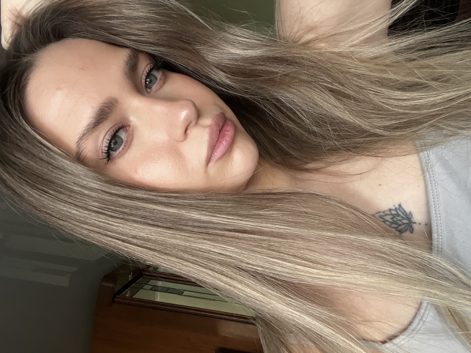 A close-up portrait of a fair-skinned woman with long, light brown hair. She has gray-green eyes and full, pink lips. A small, dark tattoo is visible on her upper chest. Part of a wooden cabinet is visible in the background, indicating an indoor setting. There is no information about the location in Khimki, Russia.