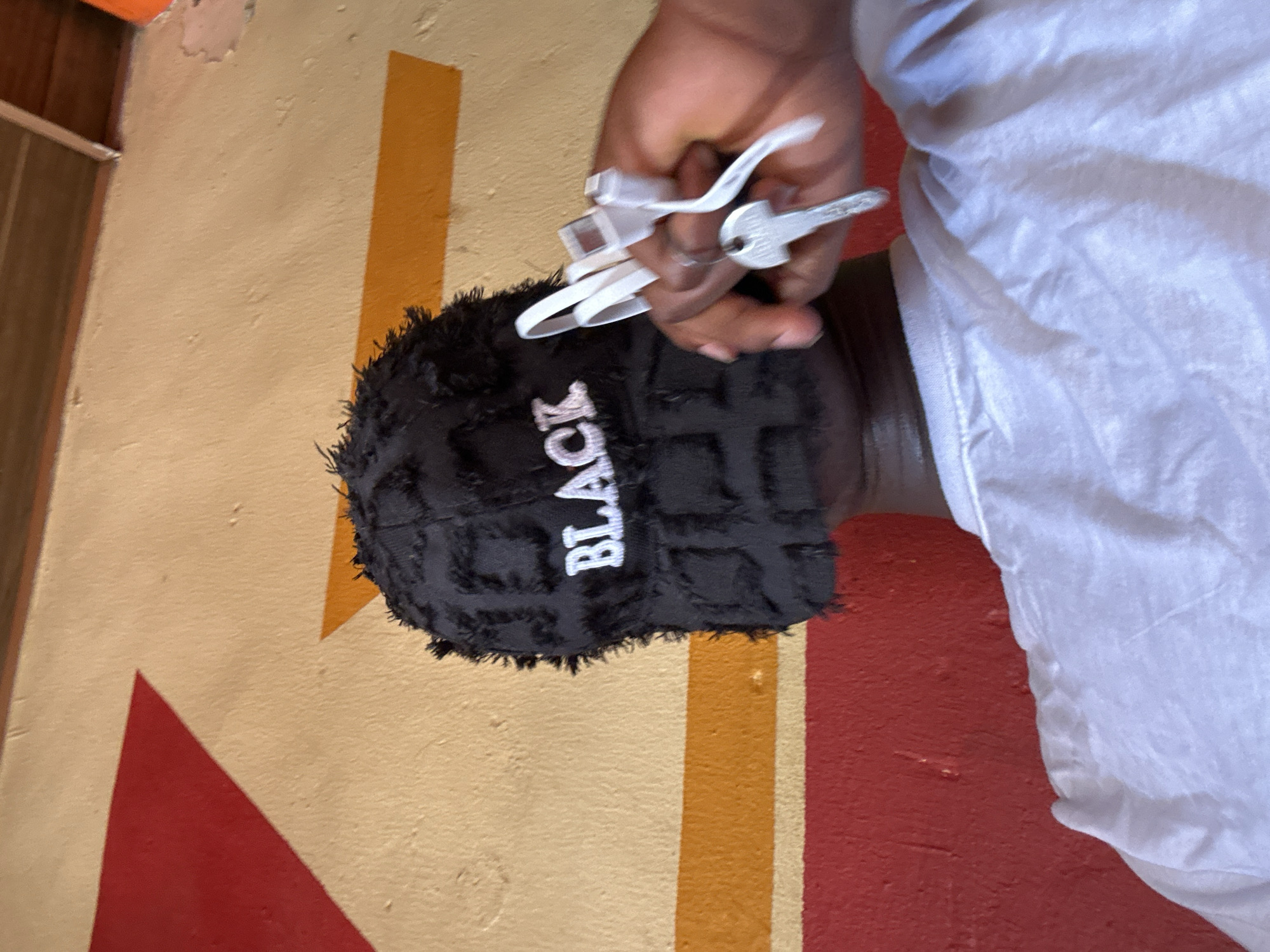 A photograph shows a close-up of a person wearing a black fuzzy cap with the word "BLACK" embroidered in white letters