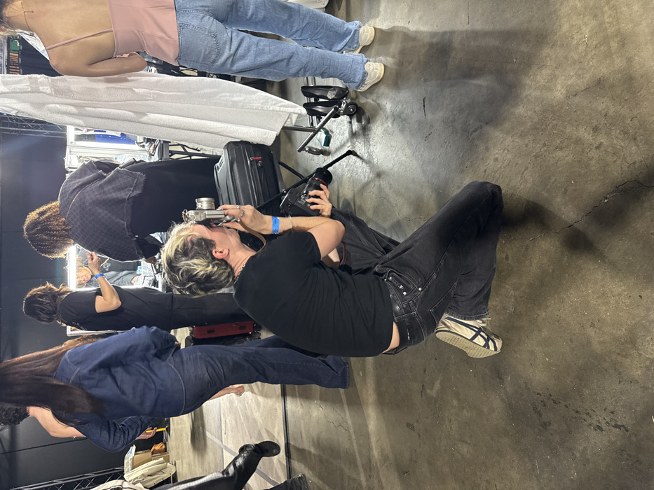 The image depicts an indoor scene in a preparation or backstage area in Issy-les-Moulineaux, France. The environment features a concrete floor with visible cracks and stains. In the foreground, a person with short, two-toned blonde and darker hair, wearing a black t-shirt, dark jeans with a visible lower back, and two-toned sneakers, is crouched on their left knee. This individual is actively photographing with a silver-colored camera held to their right eye, while their left hand holds a second black camera body with a lens, resting on a black rolling equipment case. A blue wristband is visible on their right wrist. In the mid-ground, multiple individuals are present. To the left of the photographer, a person in dark denim attire is seen from the back, alongside a partially visible bare-chested individual and another person in black leather-like pants and boots. In the central mid-ground, two individuals are positioned around illuminated vanity stations. One person with dark hair, wearing a black t-shirt and pants, appears to be working, possibly on hair or makeup, near a red rolling suitcase. Another person with curly dark hair, wearing a dark textured top over a black dress, is also engaged in activity at a vanity station. To the right, a person with light hair, seen from the back, wears a pink sleeveless top and light blue jeans, standing near a white fabric screen suspended on a metal rolling rack. Two black high-heeled shoes are on the floor near the base of this rack. The background features stage lights and dark backdrops, suggesting a professional production setting.