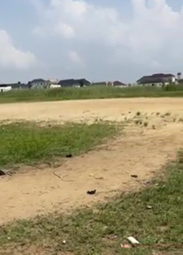 The camera pans across a grassy, dirt-filled lot towards a neighborhood in the distance under a partly cloudy sky