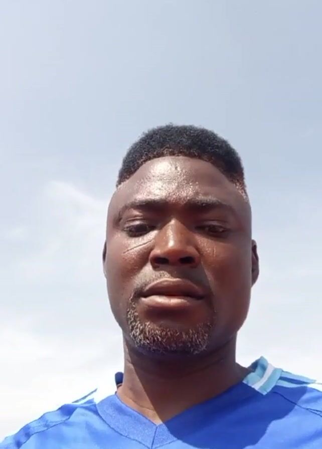 A close-up of a man wearing a blue soccer jersey with the Argentinian soccer emblem on it. He has short hair and a neatly trimmed beard. The background shows cars parked on a dirt lot under a bright sky.